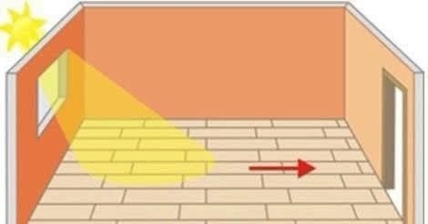 5. Укладання паркетних дощок починають вздовж довшої стіни при прямолінійному способі укладення. Зазвичай їх кладуть по довжині приміщення, а квадратній кімнаті – паралельно напрямку світла, падаючого з вікна. Можна покласти дошки діагонально. Це зробить дизайн кімнати оригінальнішим.